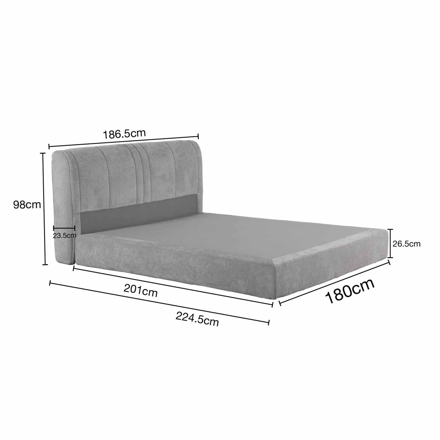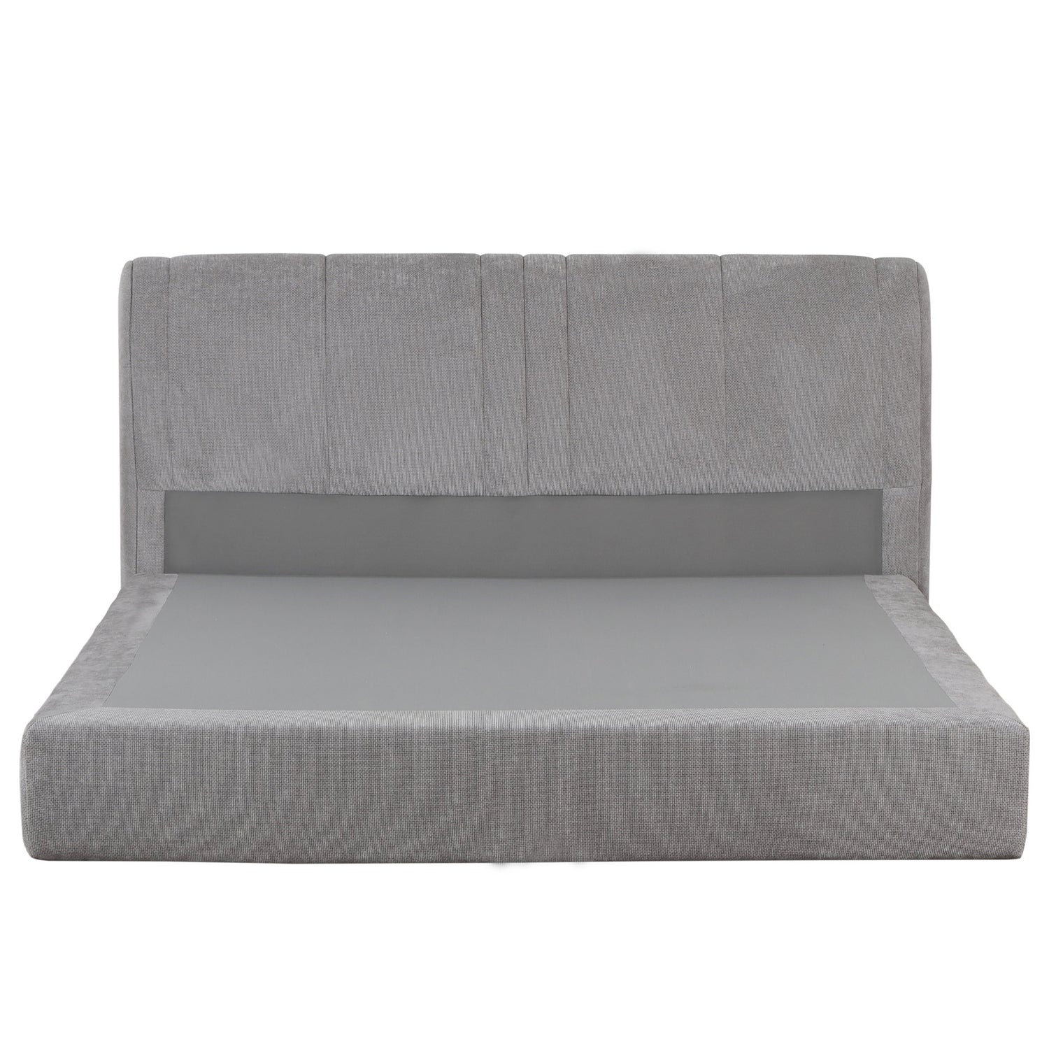 سرير بتصميم عصري باللون الرمادي، مزود بقاعدة متينة، ومسند رأس مرتفعة لإحساس مريح وأنيق بطابع فاخر ومختلف بخشب عالي الجودة.
