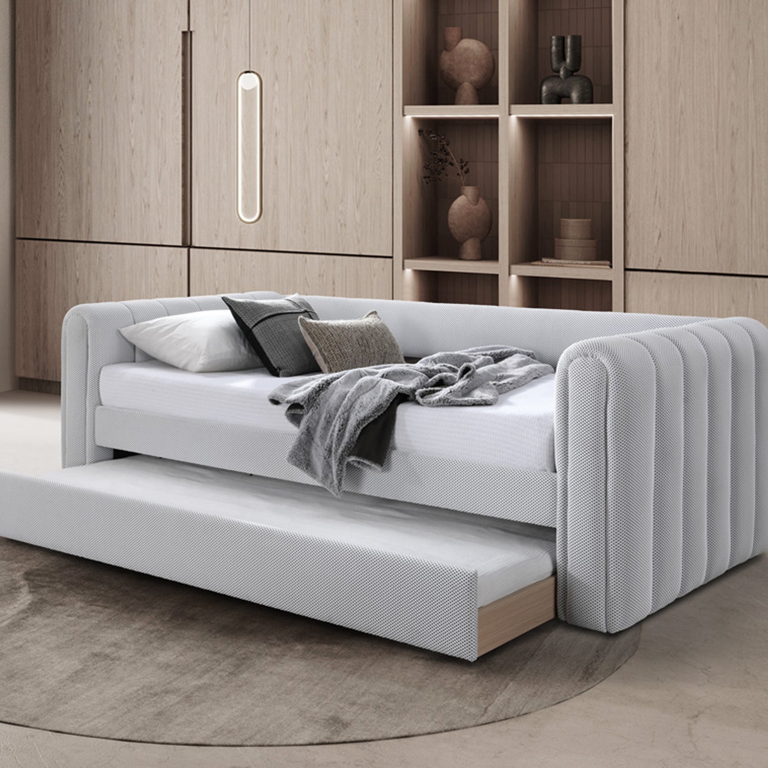 سرير مفرد أنيق بلون أبيض ناعم وتصميم بسيط وعصري، مزوّد بسرير سفلي سحب يمكن استخدامه عند الحاجة. مصنوع من هيكل خشبي مدعوم بشرائح دعم علوية وسفلية لتوفير راحة واستقرار مثالي. يتميّز بقماش سهل العناية، مع أرجل انسيابية.