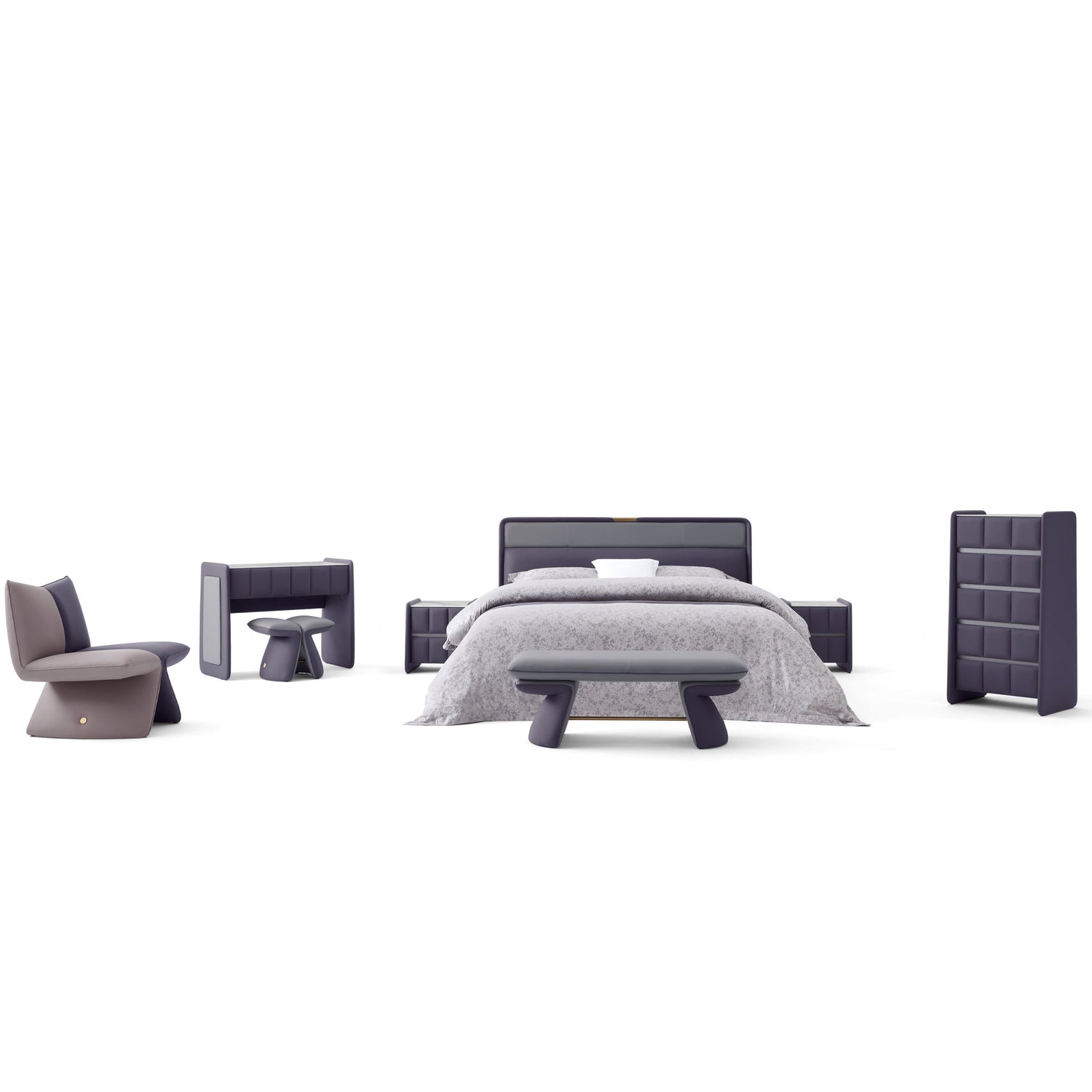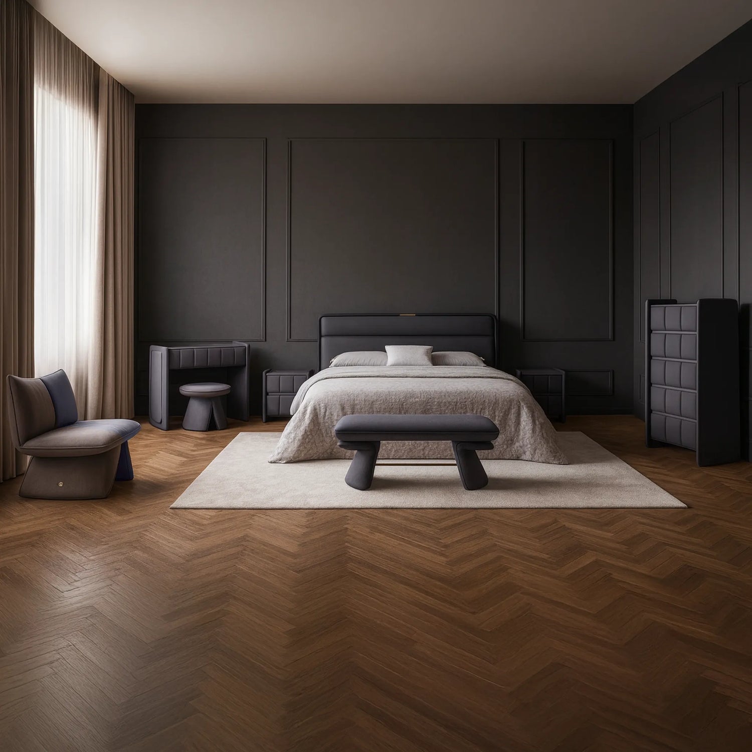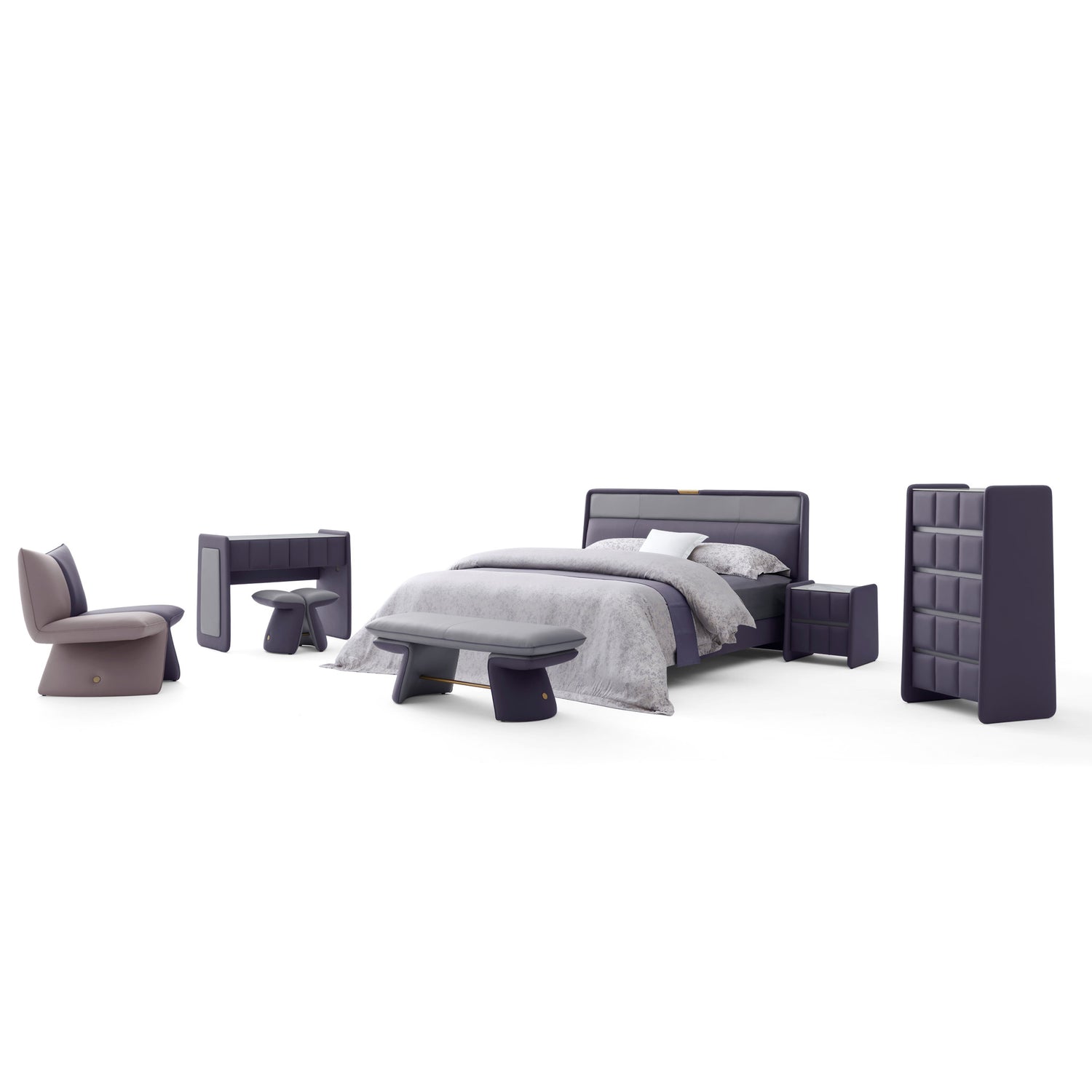 تتألف المجموعة من سرير أنيق، طاولة سرير جانبية عملية، تسريحة أنثوية راقية، و وحدة أدراج أنيقة للتخزين. تم تصنيع الهيكل من خشب صلب لمتانة عالية، مع خشب رقائقي (Plywood) يعزز المتانة، إضافةً إلى دعم من المعدن ليمنح ثباتاً مثالياً.
