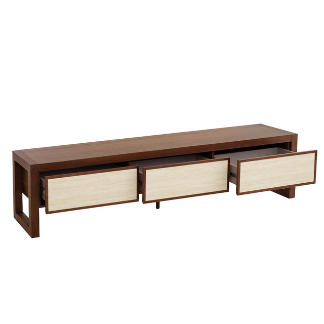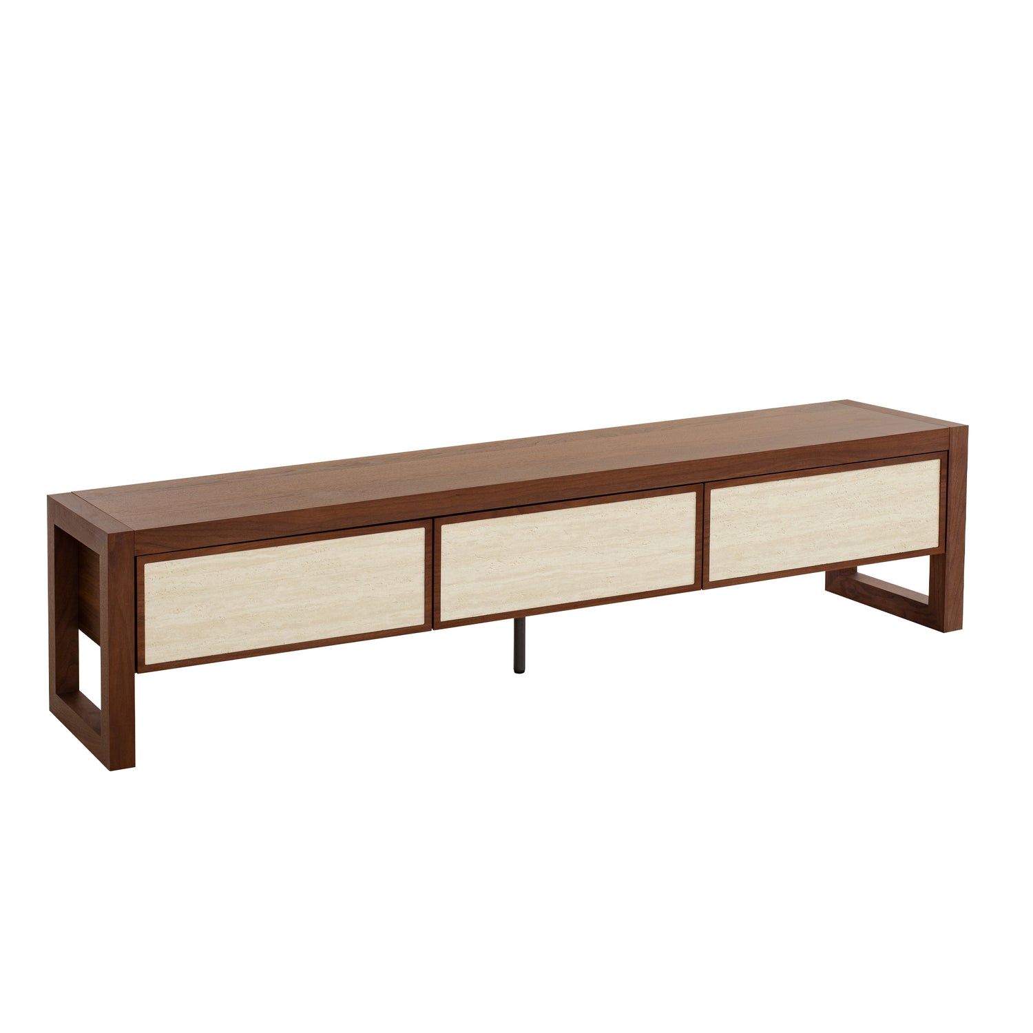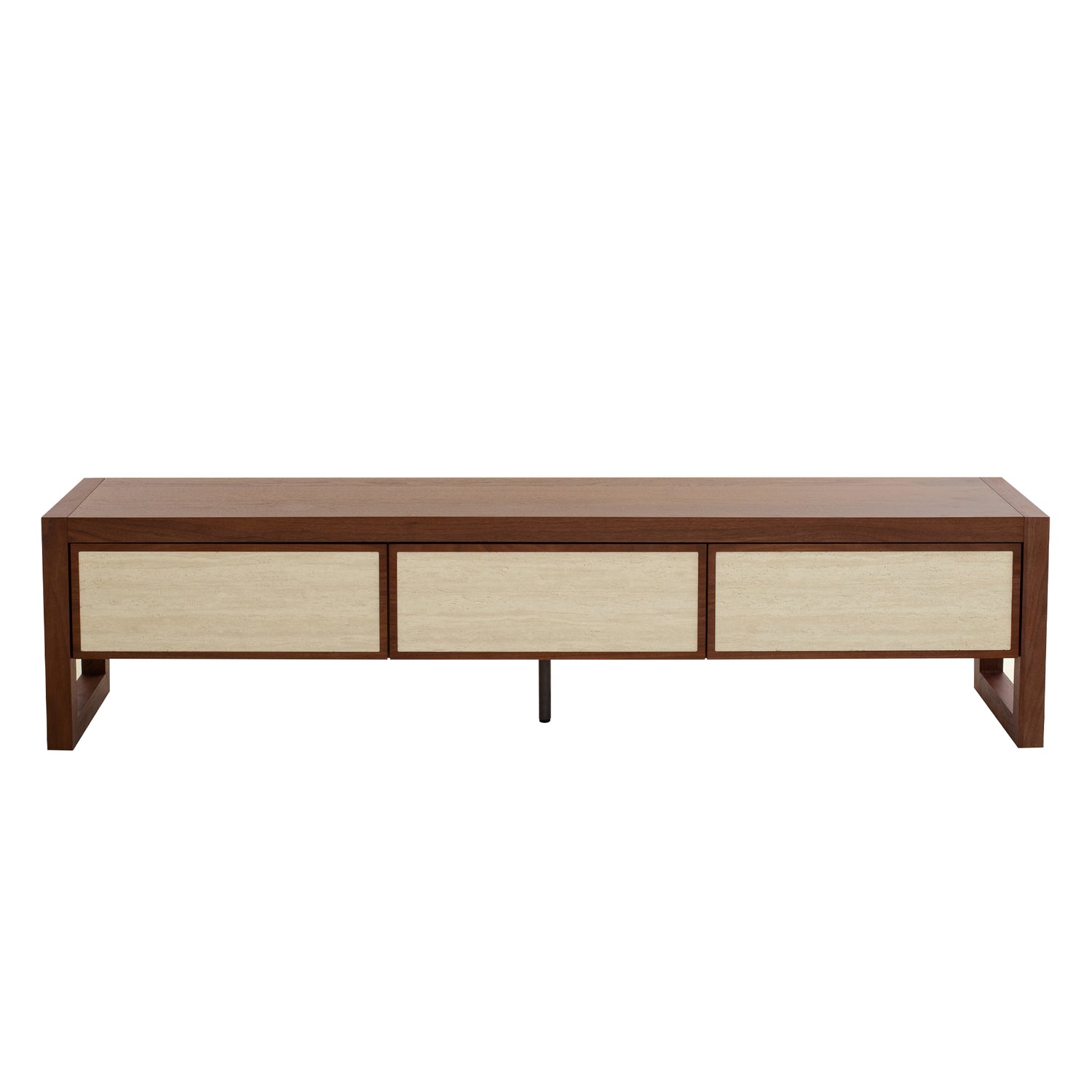 طاولة تلفزيون أنيقة تجمع بين الأناقة والعملية في تصميم متوازن وفخم. مصنوعة من خشب صناعي عالي الجودة بلمسات حجر طبيعي لامع تمنحها مظهرًا أنيقًا وحضورًا مميزًا. تتميز بمساحة واسعة لحمل الأجهزة والإكسسوارات مع لمسات فنية تضفي الفخامة على المجلس.