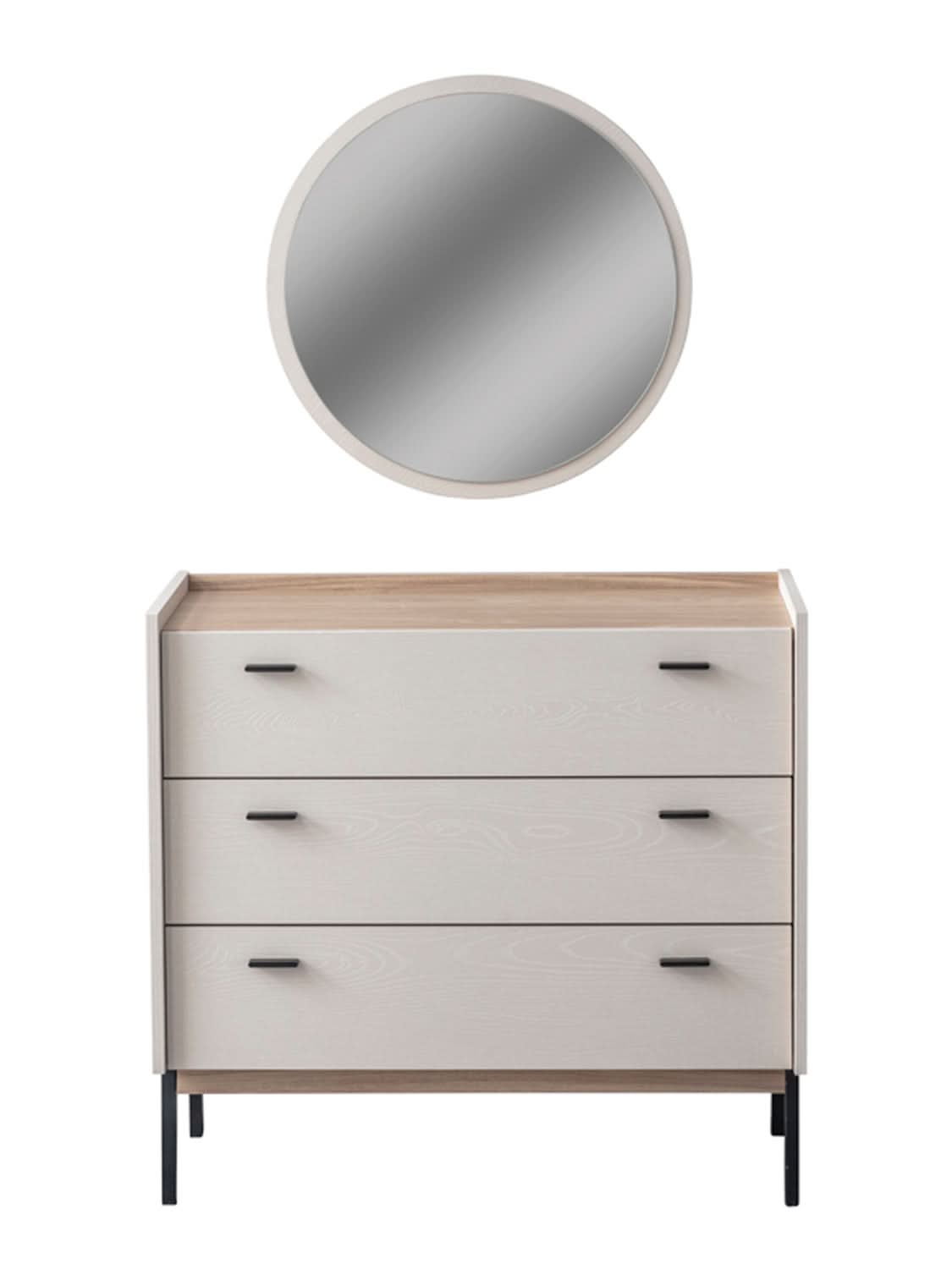 طاولة زينة أنيقة باللون الأبيض الخشبي، مصمّمة بأسلوب يجمع بين البساطة والدفء. تأتي مع مرآة متناسقة تضيف إحساساً بالاتساع والضوء للمكان.