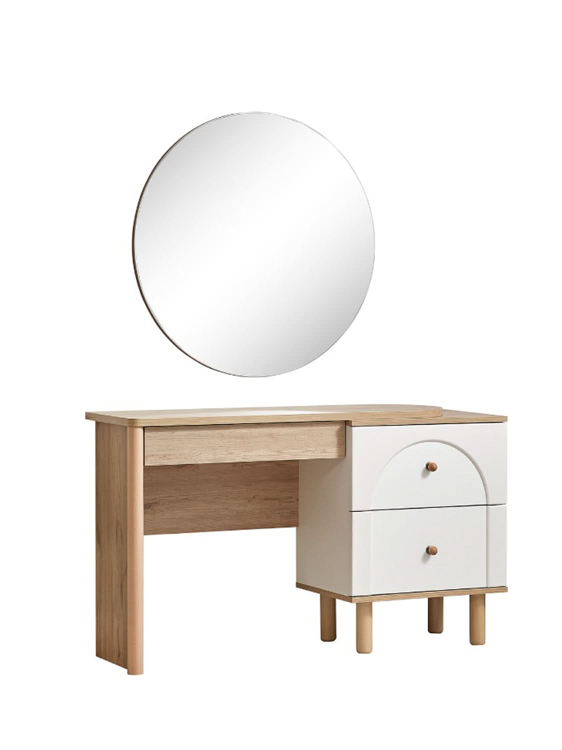 تجمع بين الفخامة والتصميم العصري، حيث تتميز بلون الكريم الأنيق الذي يضفي لمسة من الهدوء والجمال على الغرفة. المرايا الكبيرة توفر رؤية واضحة ومثالية، بينما توفر الأدراج الواسعة مساحة تخزين كبيرة للأغراض الشخصية.