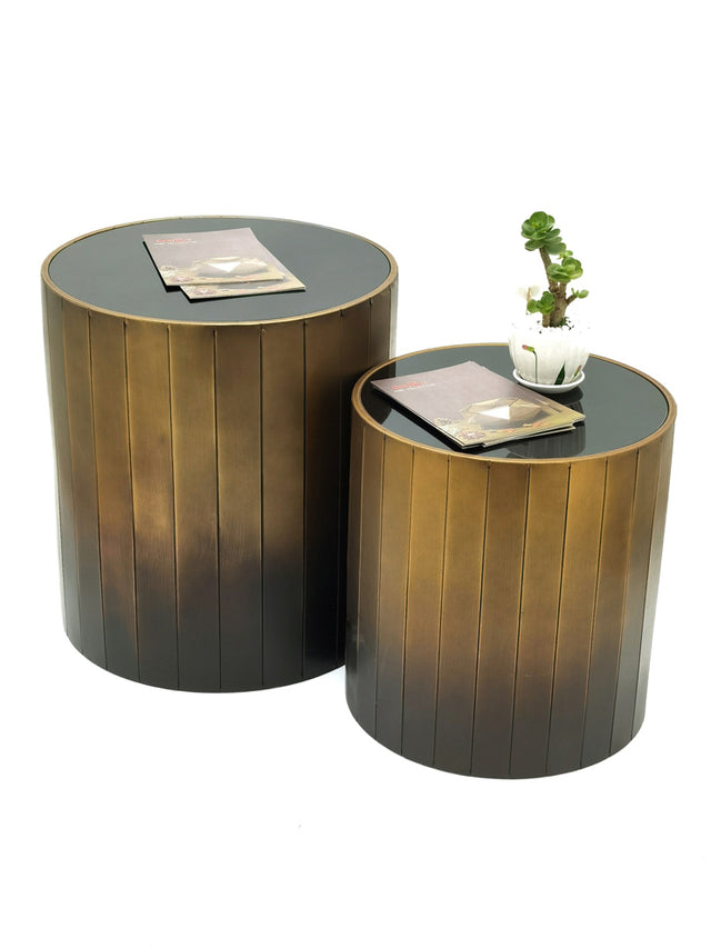 طاولة تريفا الذهبية مكونة من قطعتين تصميم عصري وفاخر، تصميمها الأسطواني العصري يجمع بين الجمال الوظيفي والطابع الخشبي الفاخر، مما يجعلها إضافة مثالية لأي غرفة، مكونة من قطعتين لإتاحة الإمكانية لتخصيص المساحة حسب الحاجة كونها طاولات القابلة للفصل، تم تصنيعها من مواد خشبية عالية الجودة تعكس الجمال الطبيعي والتفاصيل الدقيقة، يمكن استخدامها كطاولة قهوة أو طاولة جانبية في غرف المعيشة أو المساحات الأخرى.