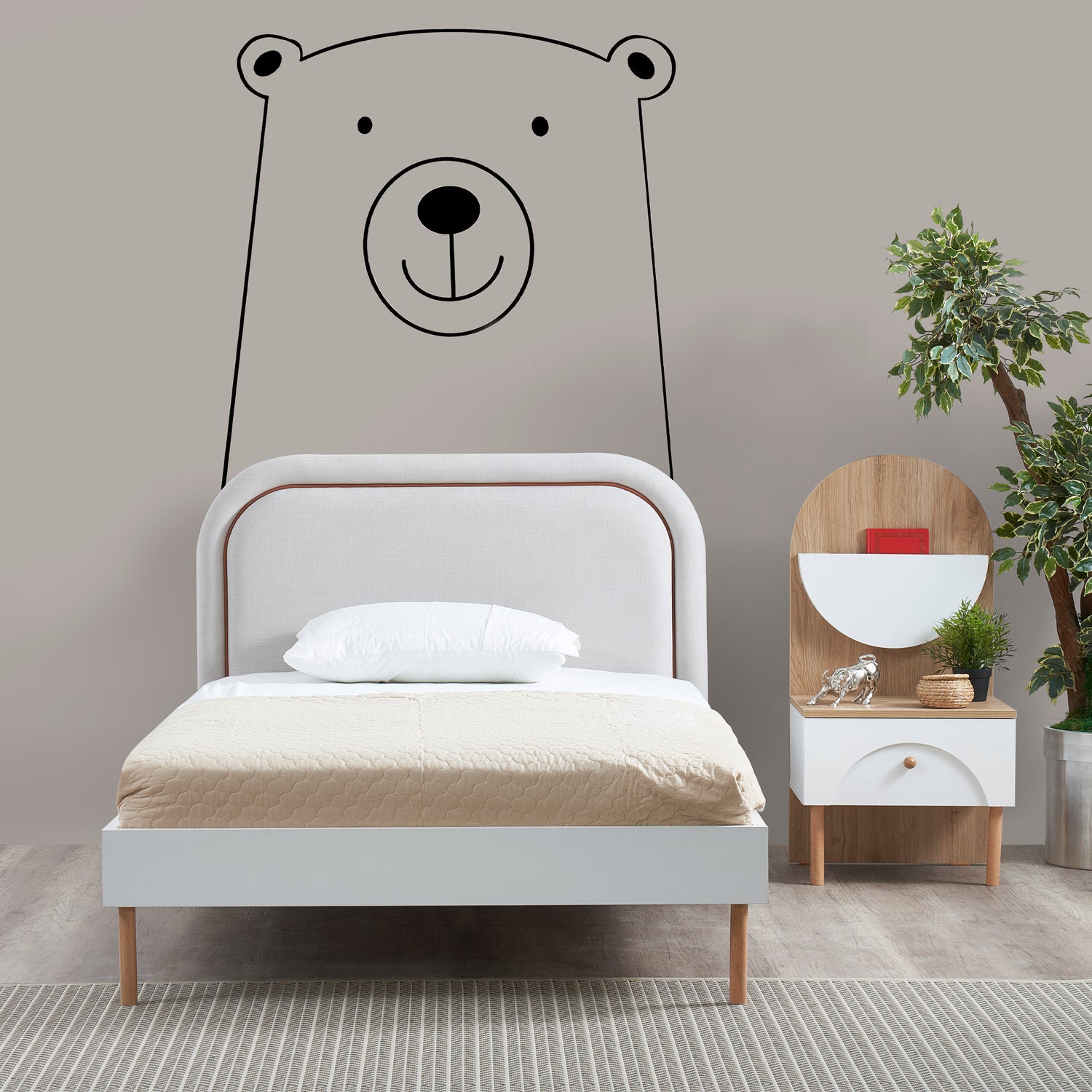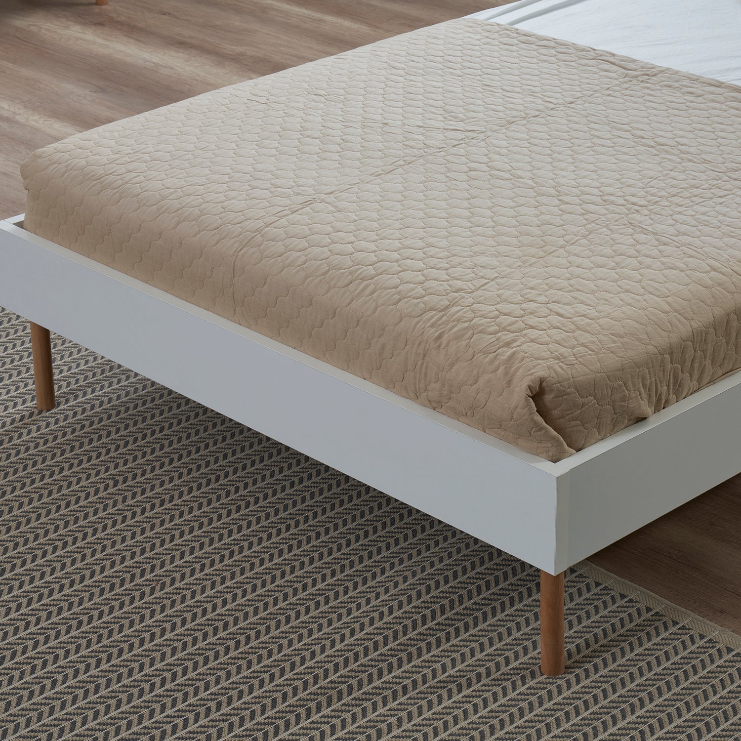 سرير، مبطّن بقماش قطني ناعم، مع هيكل من خشب عالي الجودة وأرجل خشبية متينة لضمان ثبات وراحة مثالية.