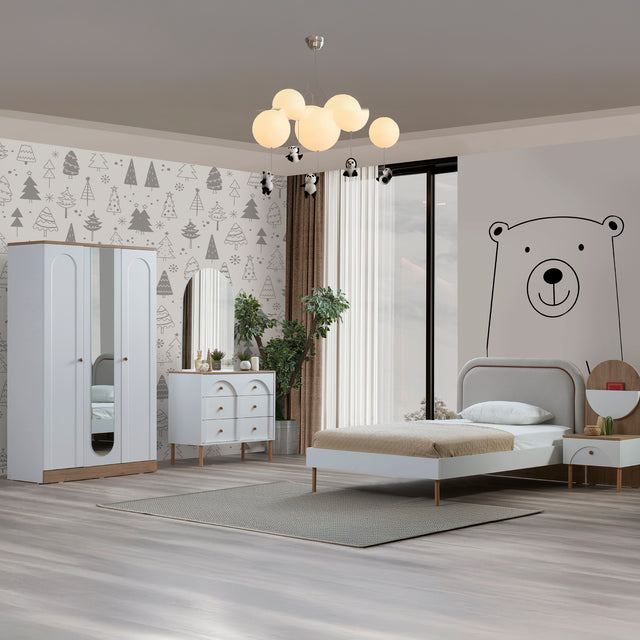 غرفة نوم للصغار متكاملة بتصميم بسيط وعصري، تدمج بين الأناقة والوظائف العملية لتناسب الاحتياجات اليومية. الغرفة تأتي بلون أبيض هادئ يمنح مساحة نظيفة ومريحة، ويضفي جو من الصفاء والانتعاش على المكان.