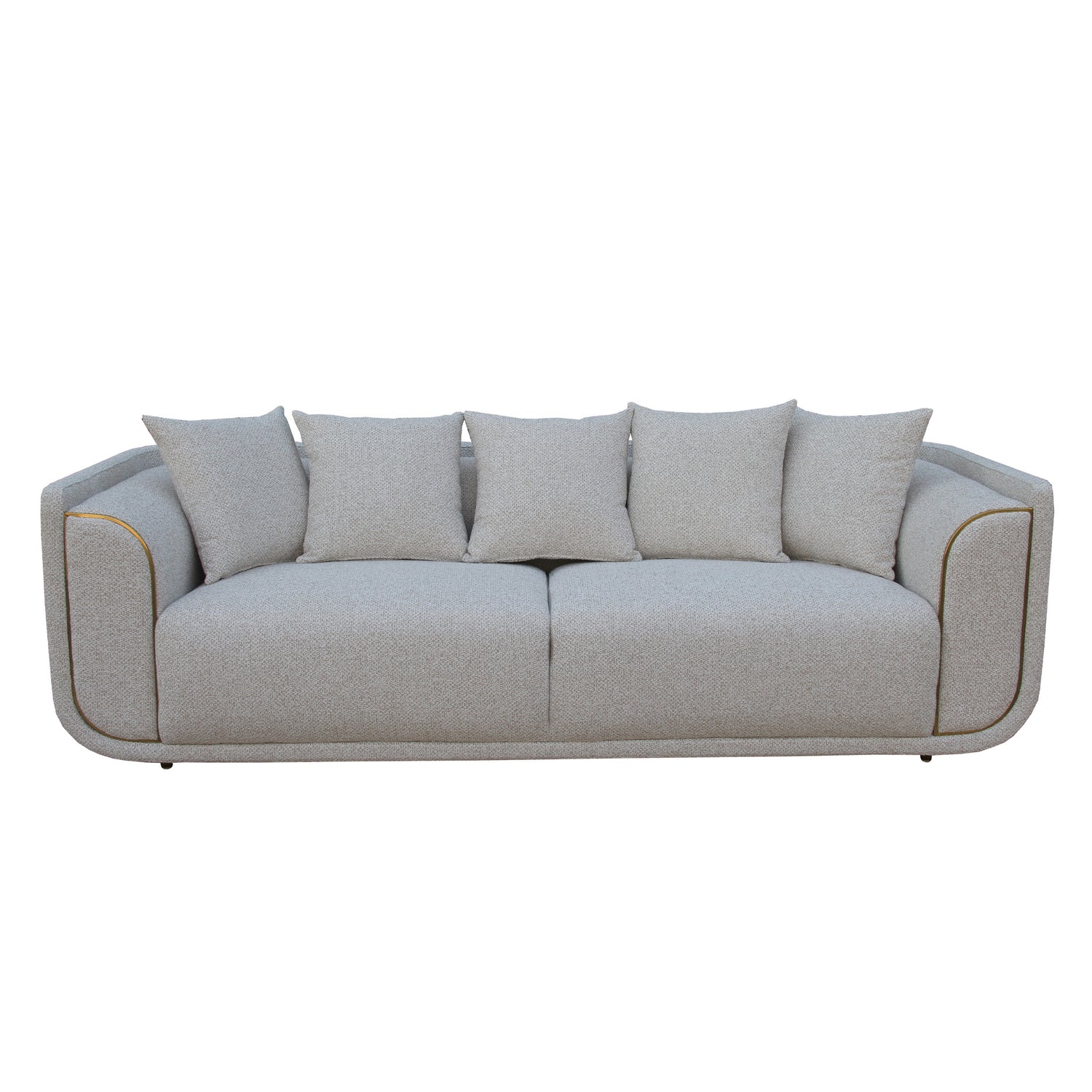 كنبة فيلارا الثلاثية هي القطعة الأكبر والأكثر رحابة في المجموعة، مصممة لتجمع العائلة والضيوف في أجواء من الراحة والفخامة. تنجيدها الفاخر من الشنيل وحشوتها الإسفنجية عالية الكثافة يمنحان جلسات طويلة مريحة، بينما تضيف التفاصيل المعدنية للفولاذ المقاوم للصدأ لمسة عصرية أنيقة.