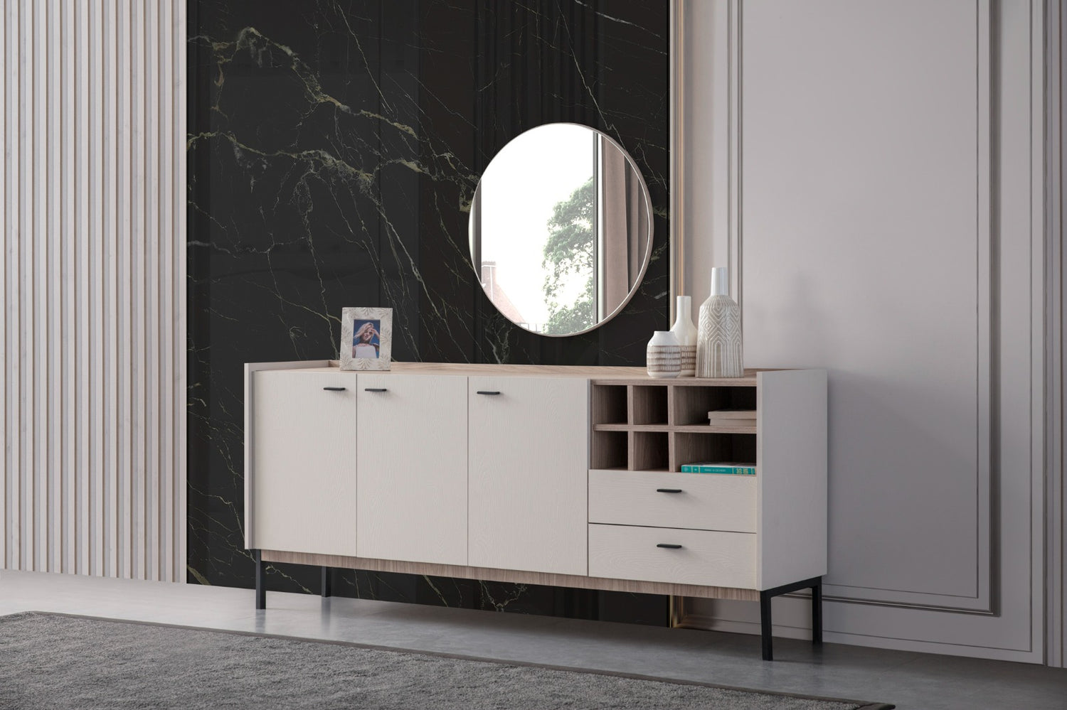 كونسول مع مرايا كريم ISTANBUL بتصميمه الرائع يعكس الفخامة والجمال العصري. توفر المرايا الفسيحة مظهرًا متجددًا للغرفة بينما يوفر الكونسول مساحة تخزين مرتبة. مثالي للمداخل أو غرف المعيشة.