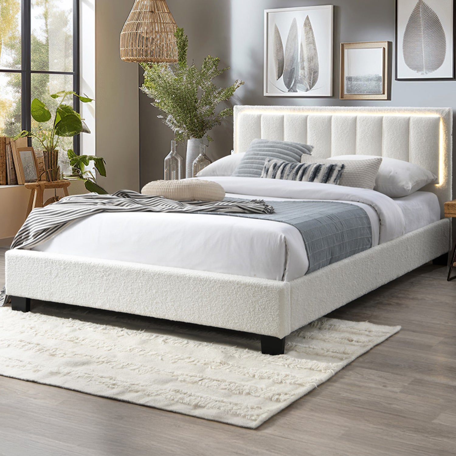 سرير بتصميم أنيق ومبطّن بلون كريمي هادئ، يتميز بلوح خلفي يغطّي كامل الواجهة الخلفية ويمتد حتى الأرض، ليعطي مظهر مرتب وفخم يناسب غرف النوم الحديثة.