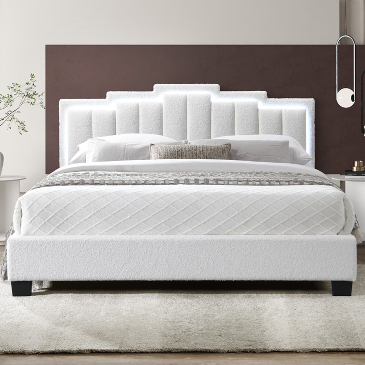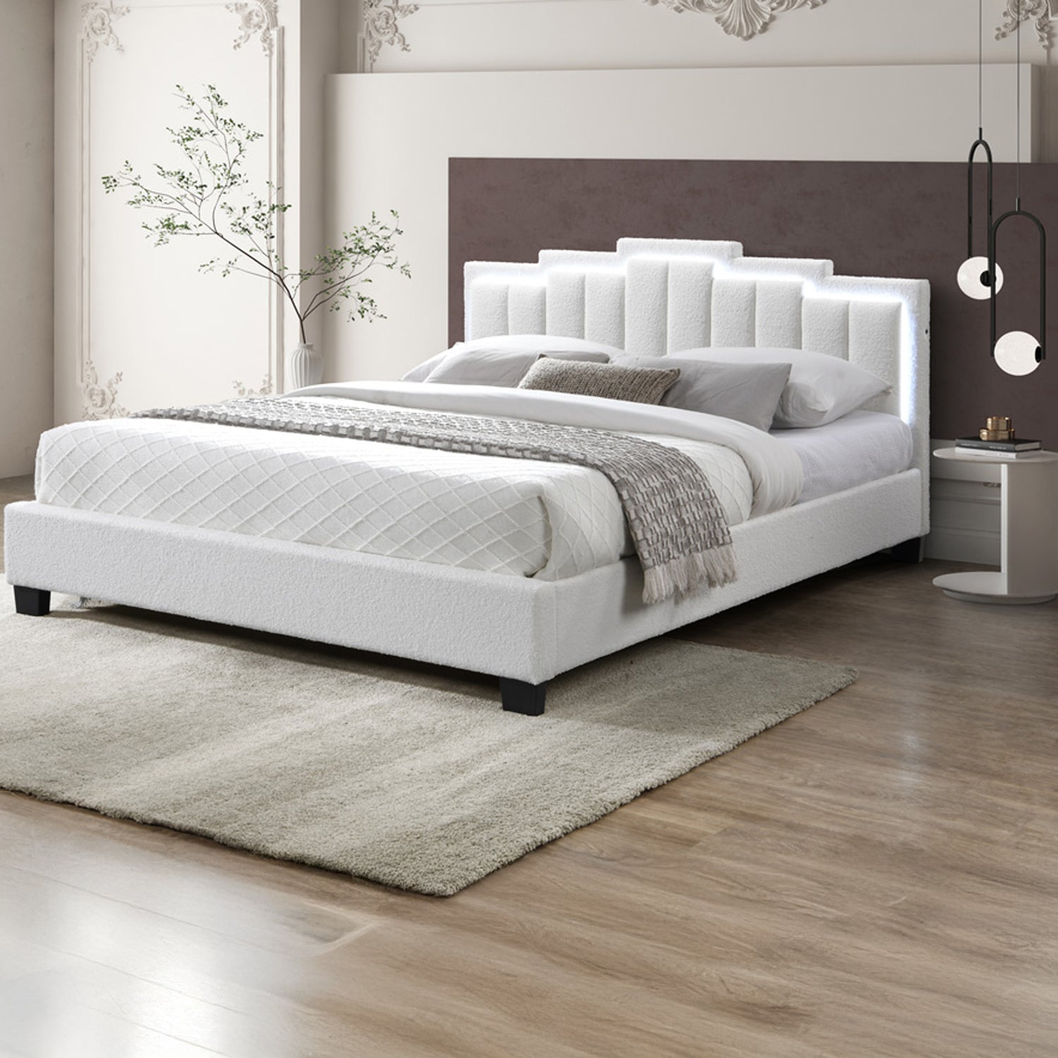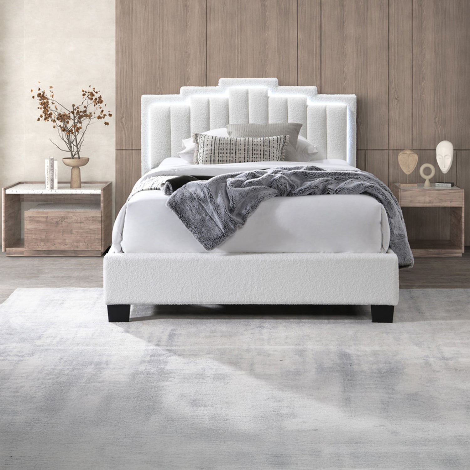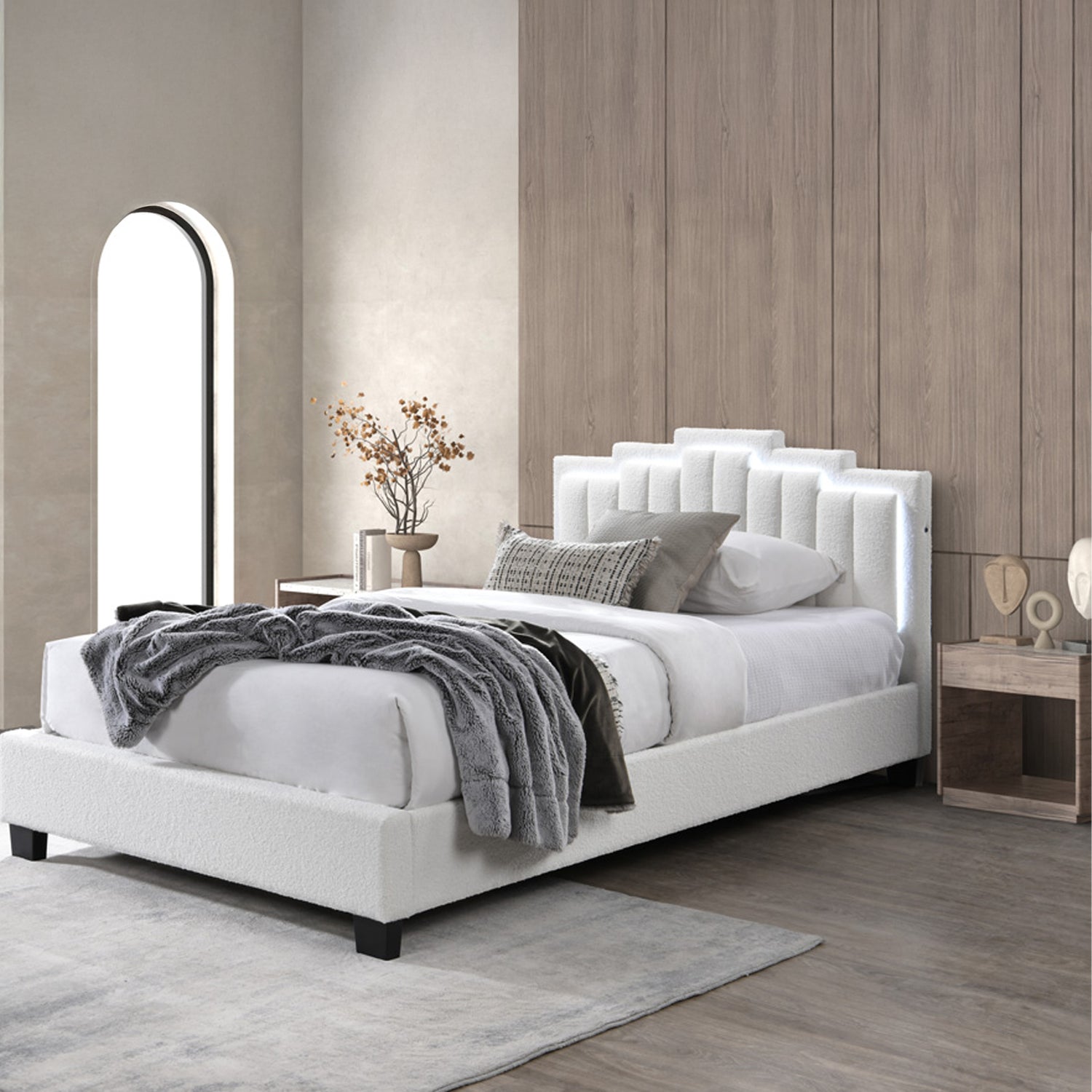 سرير بتصميم أنيق ومبطّن بلون كريمي هادئ، يتميز بلوح خلفي يغطّي كامل الواجهة الخلفية ويمتد حتى الأرض، ليعطي مظهر مرتب وفخم يناسب غرف النوم الحديثة.
