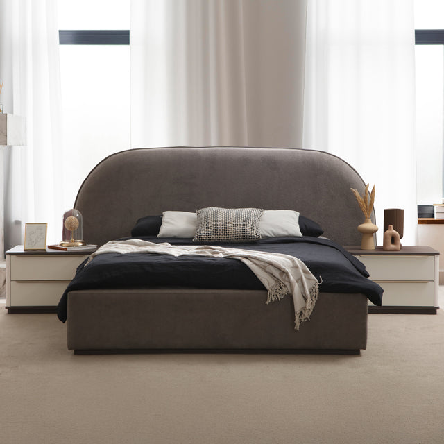 سرير بتصميم أنيق ومبطن بقماش البوكليه الناعم، مع مساحة تخزين أسفل السرير.