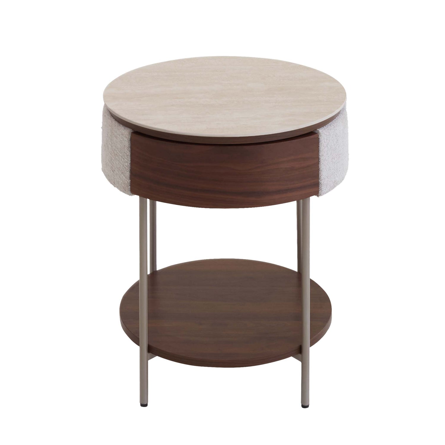 طاولة جانبية أنيقة تجمع بين فخامة الحجر وأناقة الخشب المصقول.