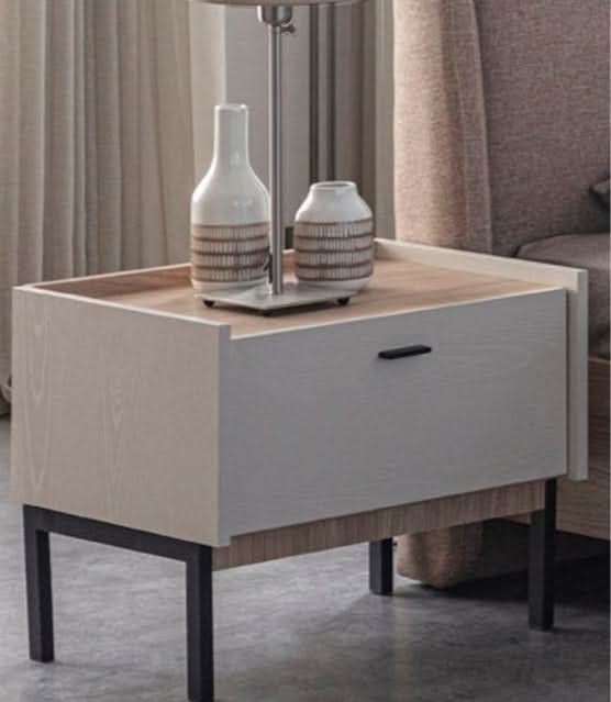طاولة سرير جانبية مزوّده بالأرجل المعدنية، تتكوّن من الخشب عالي الجودة بغطاء لامينيت، يمنحه مظهرًا أنيقًا ومقاومة ممتازة للخدوش والرطوبة. يتميّز بالنعومة وسطح سهل التنظيف، مما يجعله خيارًا عمليًا وجذابًا للاستخدام اليومي.