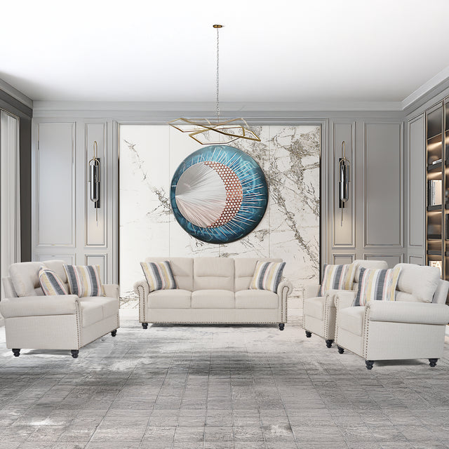 الطقم مكوّن من كنبة ثلاثية وثنائية وكرسيين مفردين، مع ست وسائد صغيرة من نفس القماش لإضفاء مظهر متناسق ومتكامل يناسب غرف المعيشة الفخمة والعصرية.