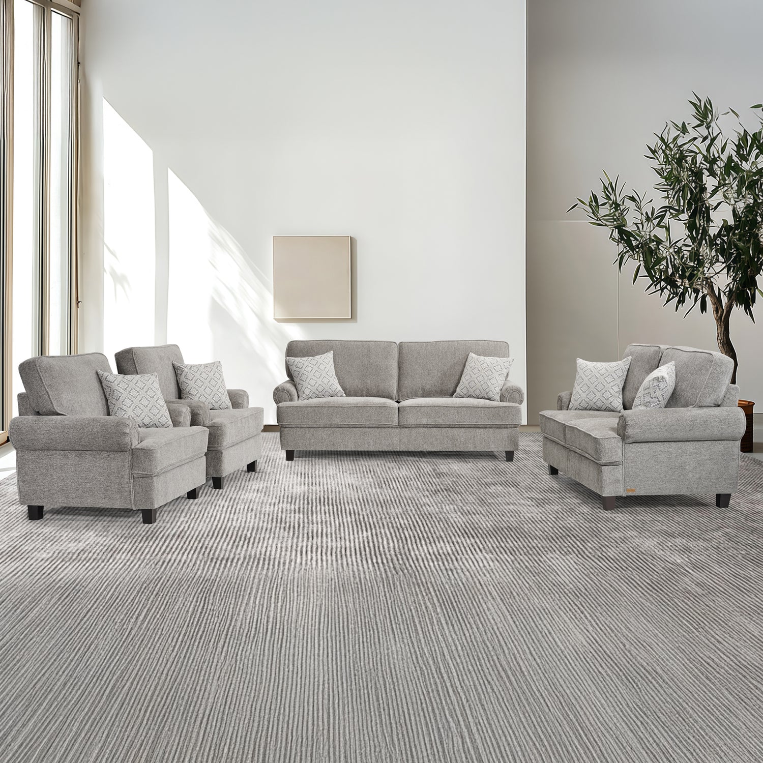 يتكوّن الطقم من كنبة بثلاثة مقاعد، وأخرى بمقعدين، بالإضافة إلى كرسيين مفردين، ليمنحك توزيعًا مرنًا يناسب جميع المساحات، ويخلق توازناً بصريًا راقياً في ديكور منزلك.