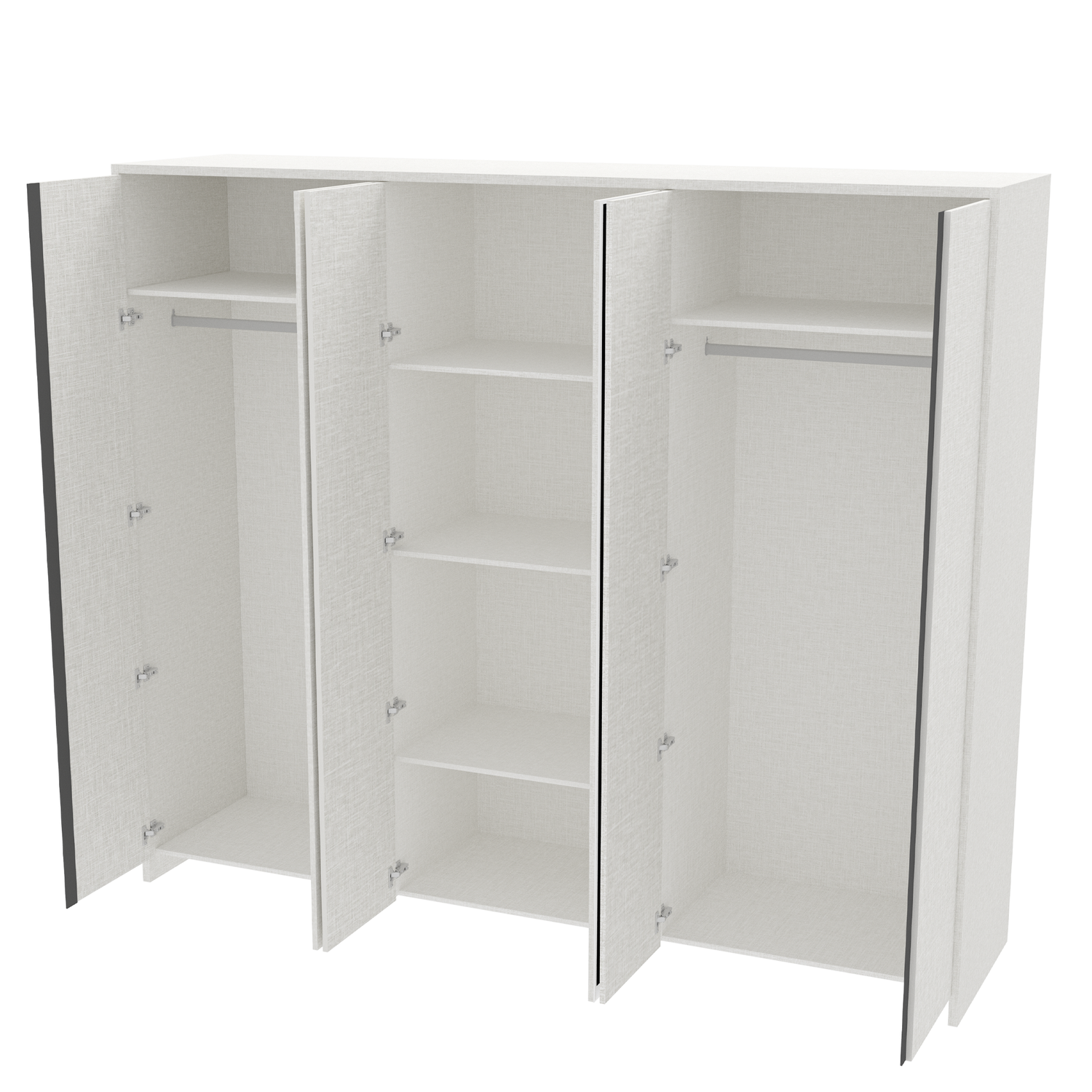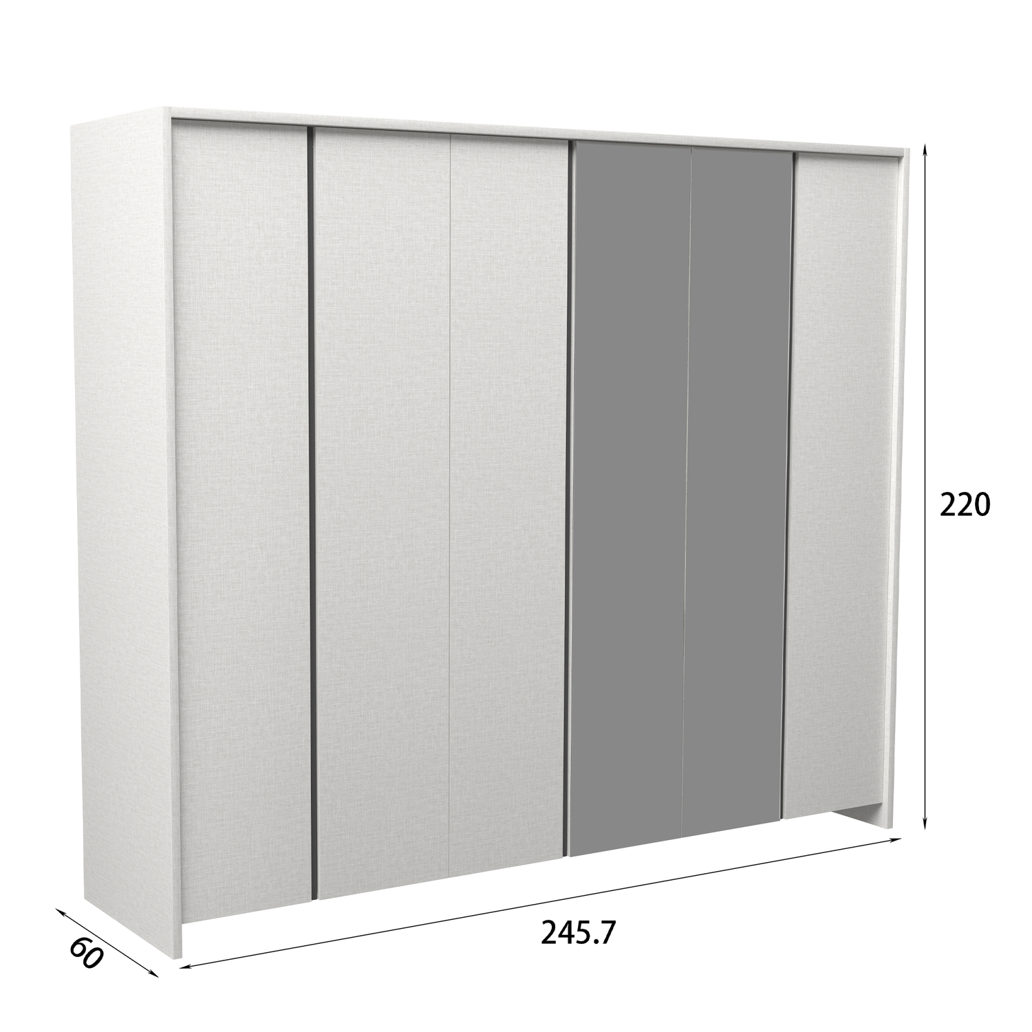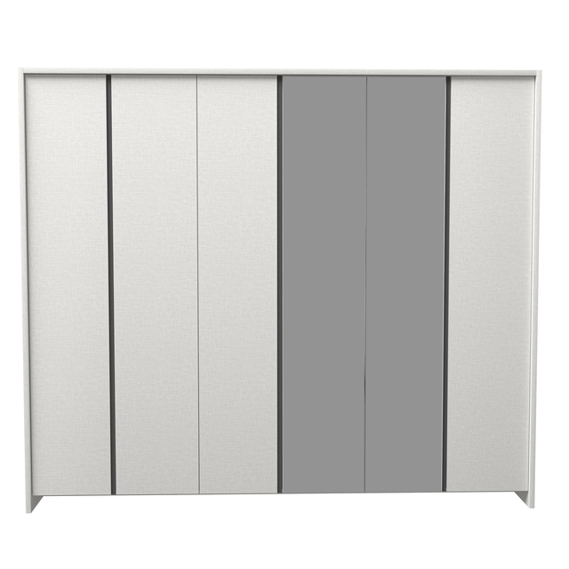 دولاب ملابس مودرن مع مرايا مدمجة ليمنح الغرفة مظهراً أوسع. مصنوع من خشب متين ويحتوي على مساحة واسعة لتعليق الملابس وتخزينها بترتيب. تصميمه الأنيق يجعله خياراً عملياً لغرف النوم الكامل