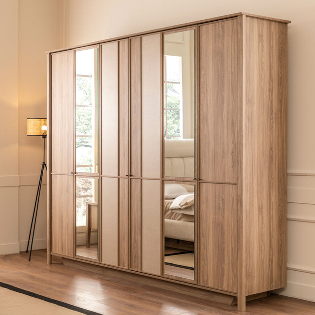 خزانة ملابس واسعة بـ 6 أبواب، توفر مساحة تخزين كبيرة ومدروسة تلبي كل احتياجاتك مع تصميم خشبي مميز وأنيق وعالي الجودة مدمج بخطوط عمودية مميزة تناسب ذوقك، وبسعر منافس.