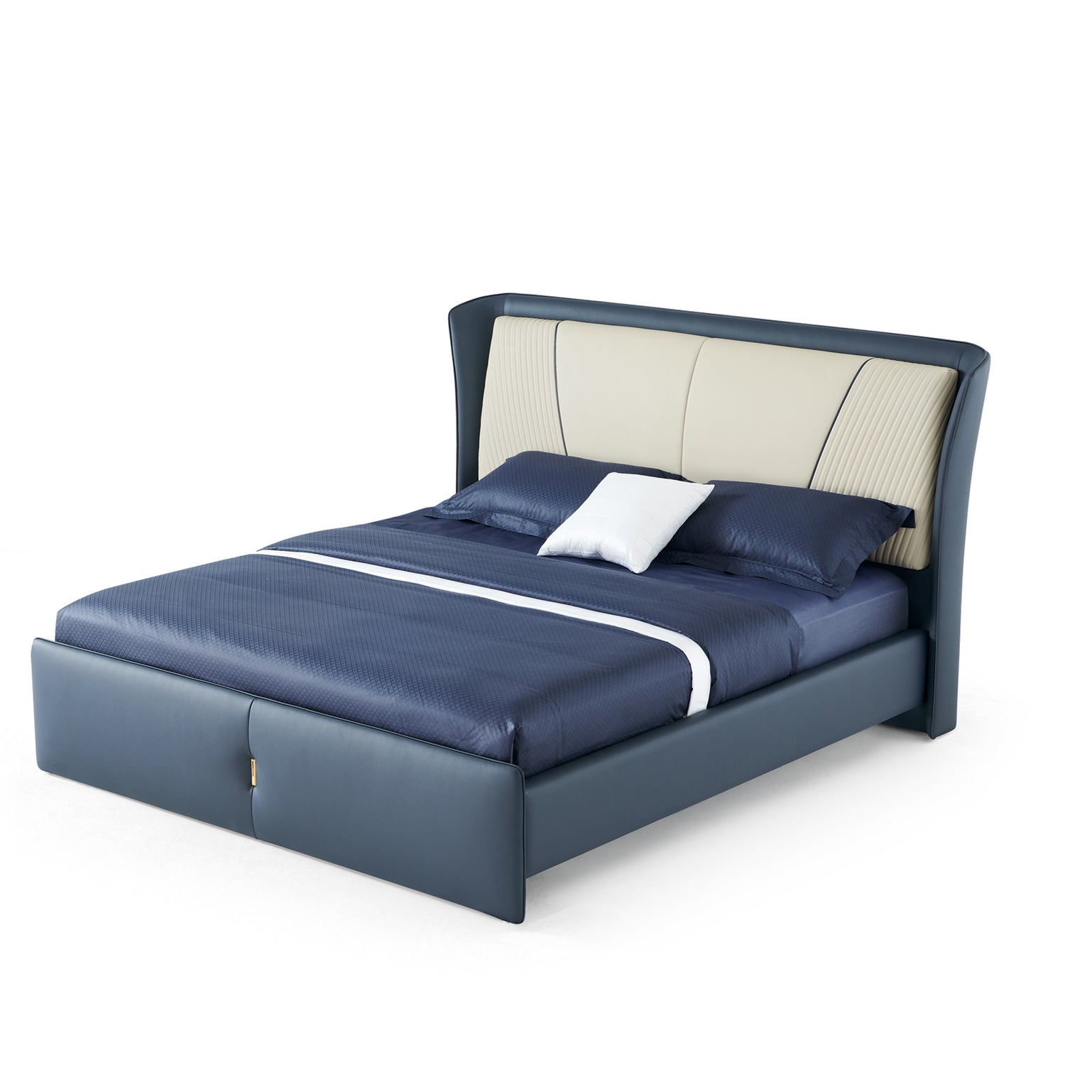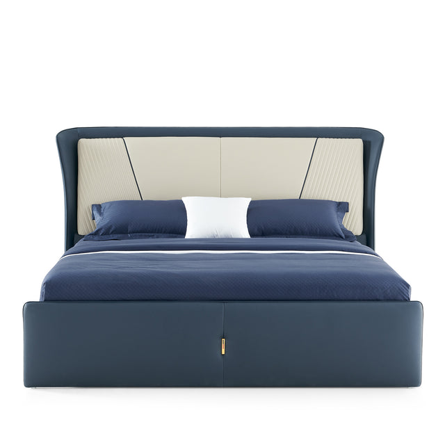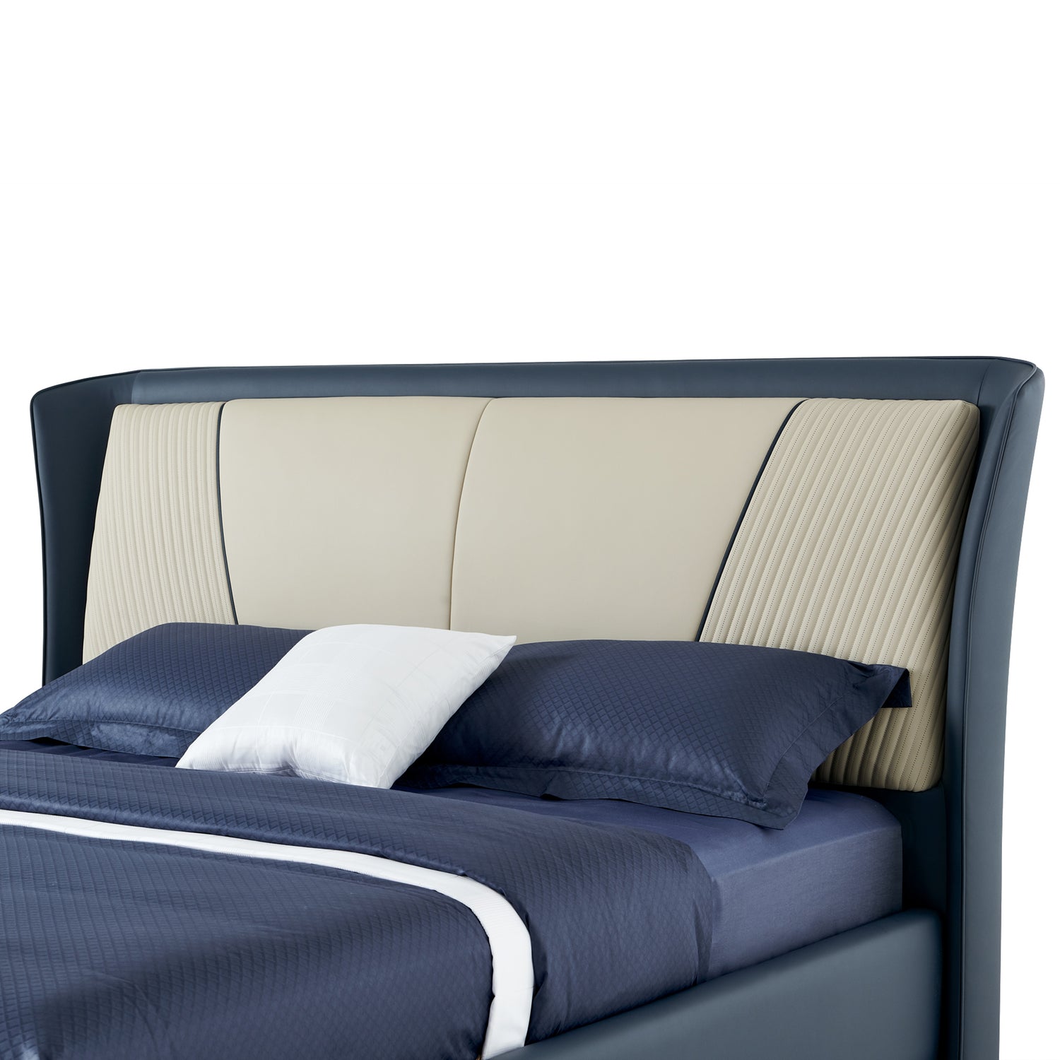 سرير عصري بواجهة فاخرة تجمع بين لوح رأس مبطّن ثنائي اللون مع لوحات جانبية مخططة تمنح عمقًا بصريًا راقيًا.