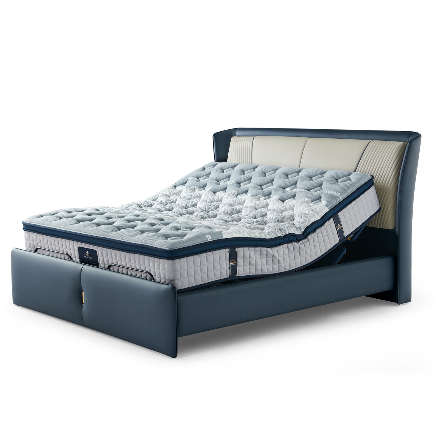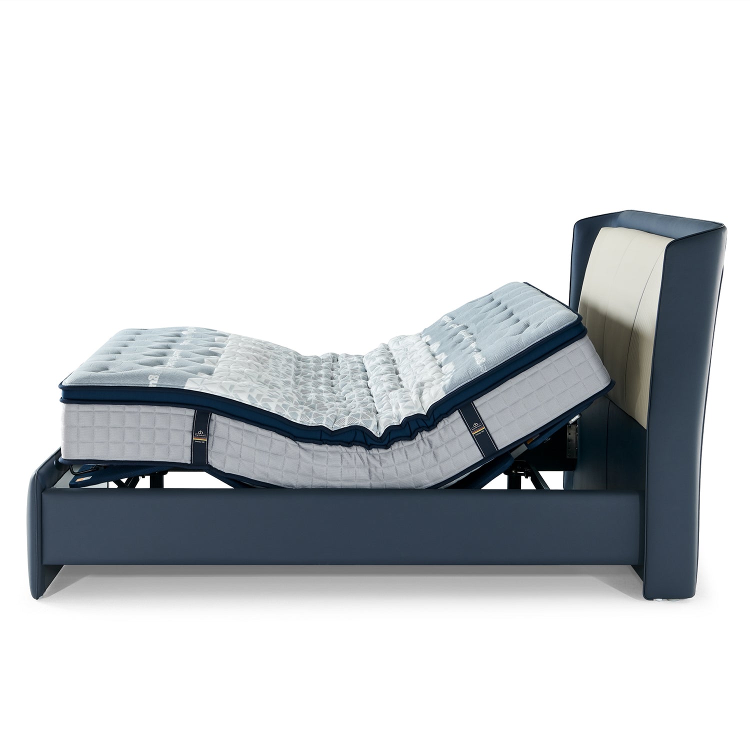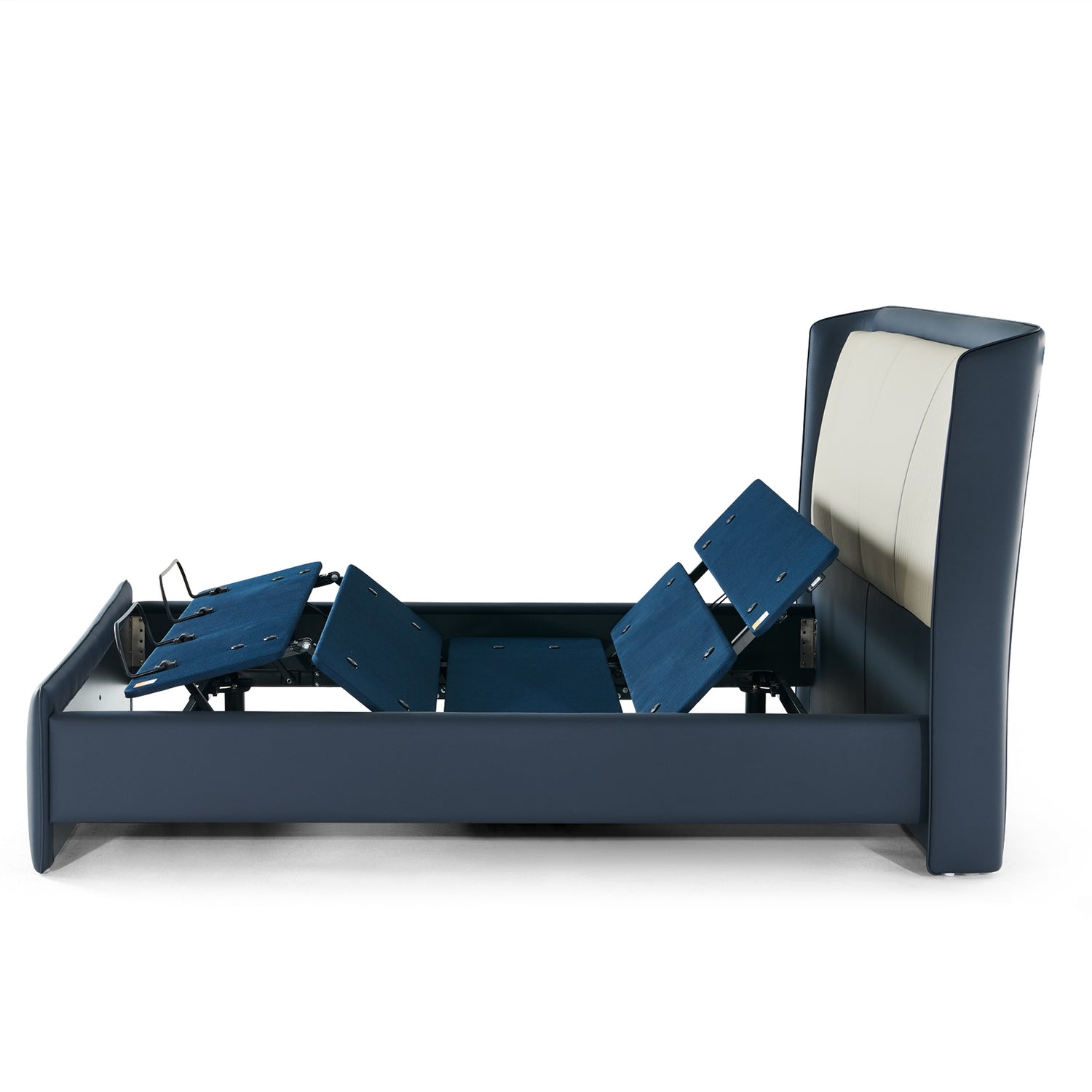 سرير عصري بواجهة فاخرة تجمع بين لوح رأس مبطّن ثنائي اللون مع لوحات جانبية مخططة تمنح عمقًا بصريًا راقيًا.