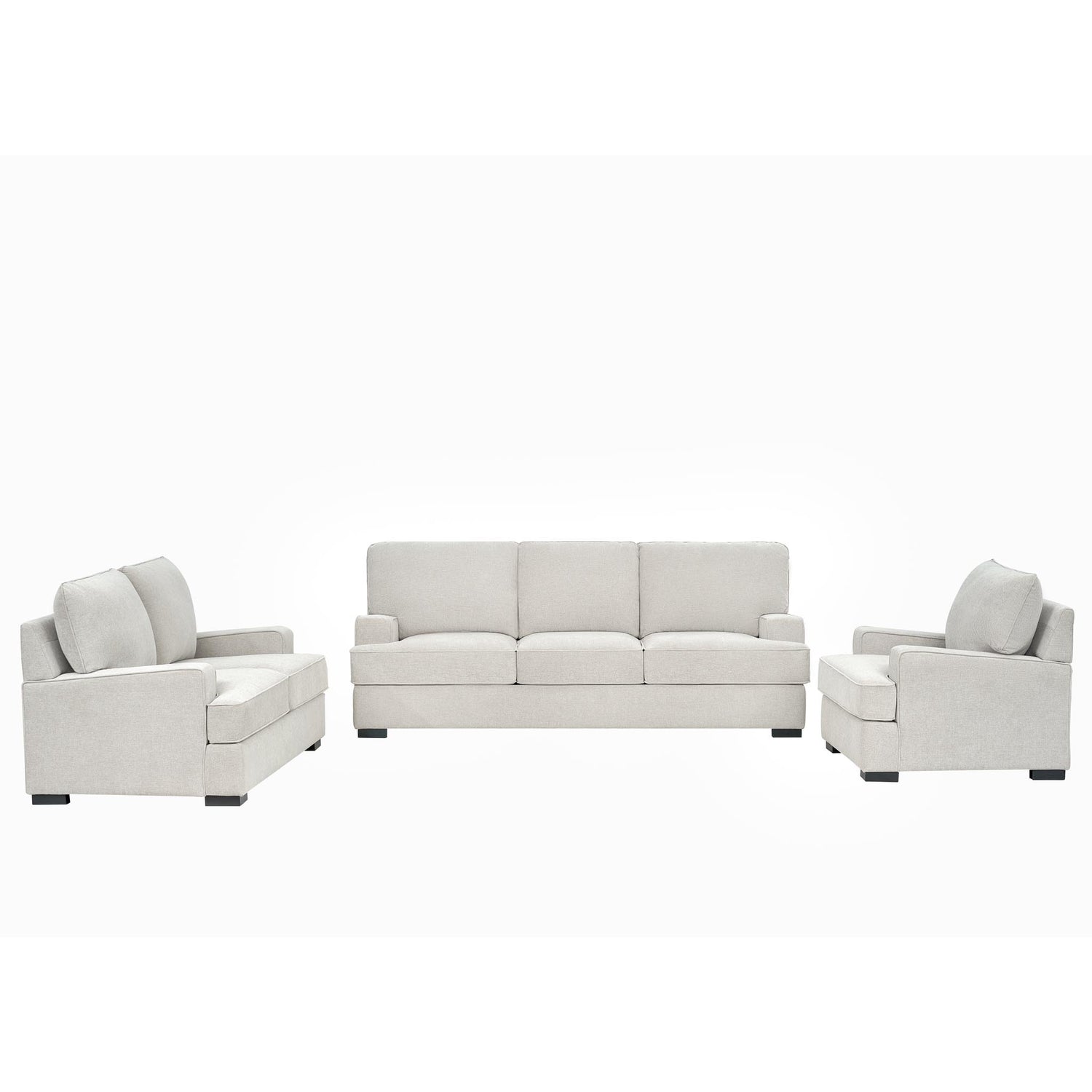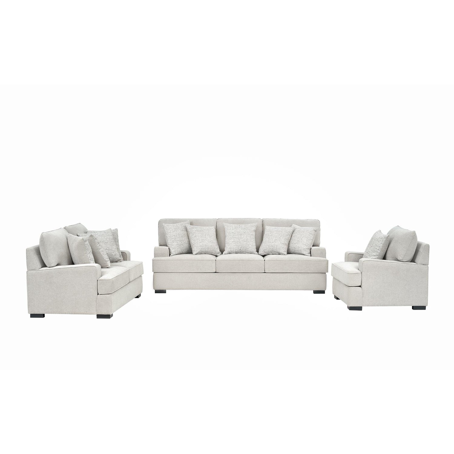 صُمم الطقم على هيكل متين من الخشب الصناعي المقوّى مع أرجل خشبية صلبة، مما يضمن لك متانة وثباتاً لسنوات طويلة. كما تأتي القطع مزودة بوسائد إضافية لتعزيز الراحة والدعم أثناء الجلوس. إنه الطقم المثالي لمن يبحث عن طقم كنب عائلي يجمع بين الأناقة المودرن والراحة العملية في اثاث الصالة أو غرفة المعيشة.