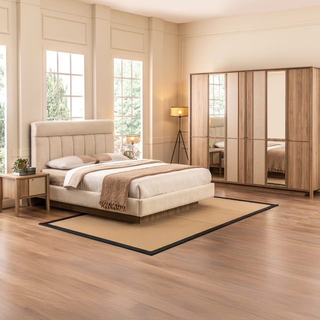 غرفة نوم "أولسو" الكاملة مكونة من 5 قطع، تجمع بين التصميم العصري والوظائف العملية. تشمل سريرًا مريحًا، دولابًا واسعًا، طاولة جانبية، ومرايا أنيقة، لتوفير بيئة مريحة وأنيقة لغرفتك.