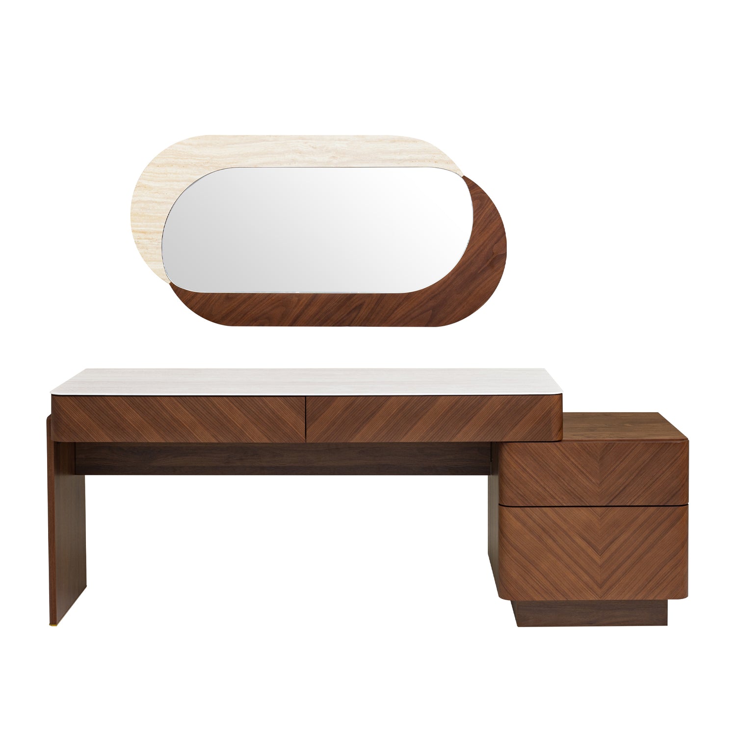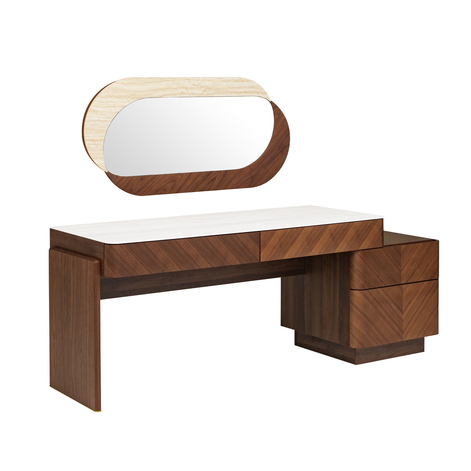 تسريحة فاخرة مع مرآة كبيرة تمنح الغرفة حضوراً ملكياً وإحساساً بالفخامة.