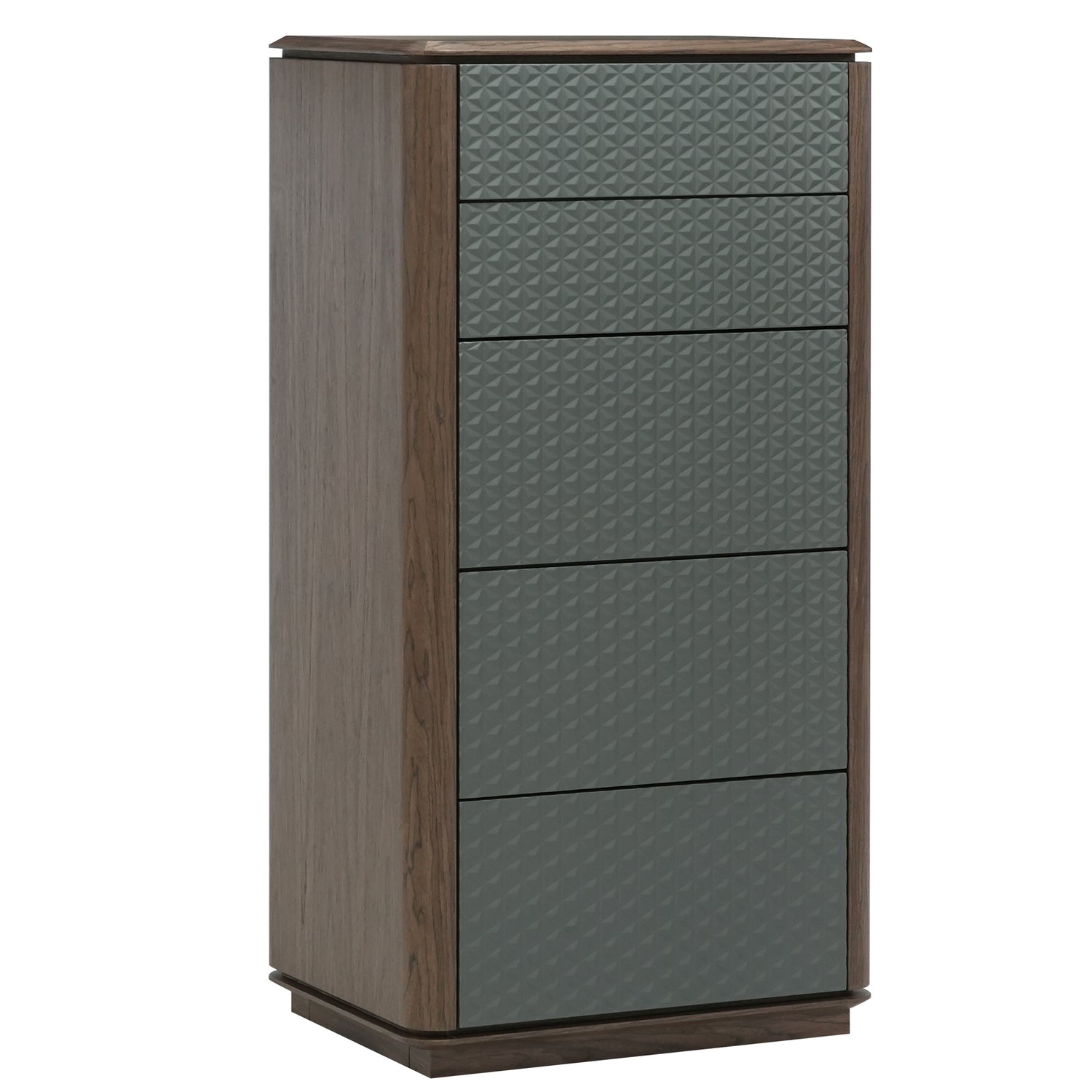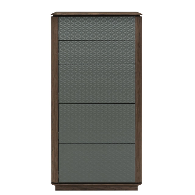 خزانة عمودية أنيقة بتصميم عصري فريد تمزج بين خشب الجوز الغني والتفاصيل الرمادية المنقوشة. تحتوي على أدراج متعددة بآلية فتح سلسة تجعلها عملية وعصرية في آنٍ واحد. تناسب المساحات الصغيرة وتمنح الغرفة مظهرًا متكاملًا يجمع بين الوظيفة والجمال بتوازن مثالي.